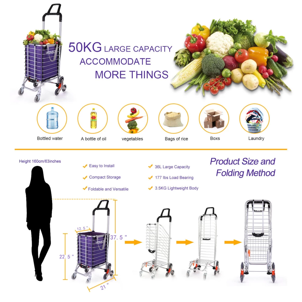 اجعل التسوق ونقل الأغراض الثقيلة أكثر سهولة مع عربة التسوق القابلة للطي للخدمة الشاقة. تم تصميمها لأقصى درجات الراحة، وهي خفيفة الوزن لكنها متينة، مما يجعلها مثالية للتسوق، حمل الغسيل، مستلزمات التخييم، أدوات البستنة، الملفات المكتبية، والمزيد. يتيح التصميم ثلاثي العجلات حركة سلسة على الأسطح المستوية مع إمكانية تسلق الدرج بسهولة، بينما توفر العجلات الأمامية الدوارة بزاوية 360 درجة مناورة فائقة. مصنوعة من سبائك الألمنيوم عالية الجودة، وتتحمل حتى 50 كجم (176 رطلاً)، كما يمكن طيها بسهولة للتخزين المدمج.