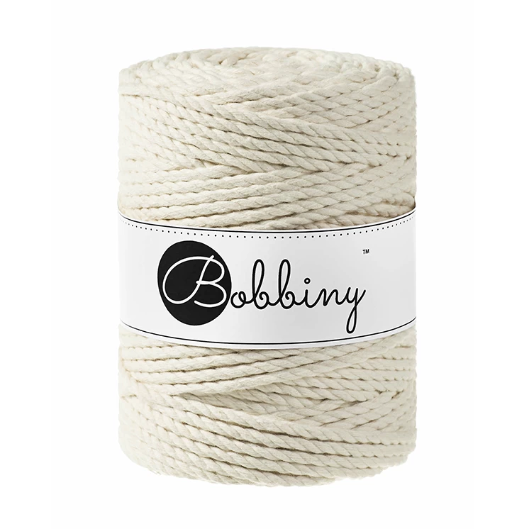 This sustainable premium macramé rope from Bobbiny is a 3-ply twist recycled cotton rope composed of 120 threads twisted into three 40 thread parts. It is perfect for macramé, weavings and any fiber art. It is super soft, smooth, knots beautifully and gives produces amazing twirly fringes and tassels. Thanks to its twisted structure it is firm and easy to work with.