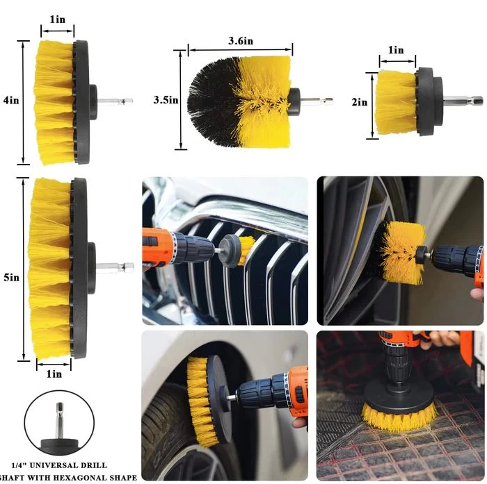 • فرشاة كهربائية متعددة الاستخدامات – 4 مقاسات من الفُرَش النايلون متوسطة الصلابة (2.5”، 3.5”، 4”، 5”) لتنظيف الإطارات والسجاد وحتى الحمام والمطبخ بدون خدوش.