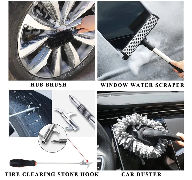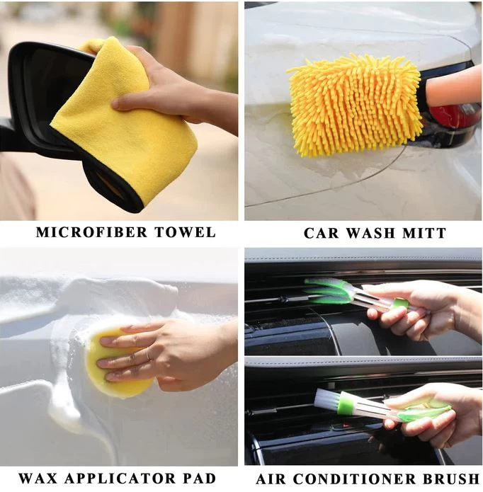 • مجموعة أدوات تنظيف متكاملة – تشمل فوطة مايكروفايبر، قفاز غسيل، وسادتين لتطبيق الشمع، فرشاة الإطارات، فرشاة فتحات التكييف، مكشطة زجاج، أداة إزالة الحصى من الإطارات، وصندوق تخزين مرتب.