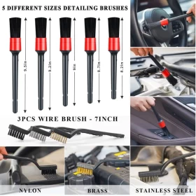• فُرَش تفصيلية وفرش معدنية – 5 فُرَش ناعمة للتفاصيل لتنظيف الفتحات والزوايا الصغيرة، و3 فُرَش معدنية (فولاذ، نحاس، نايلون) لإزالة الصدأ والأوساخ الصعبة.