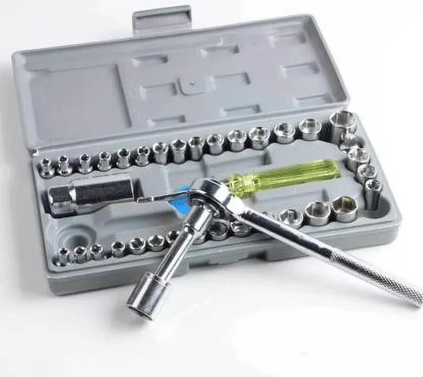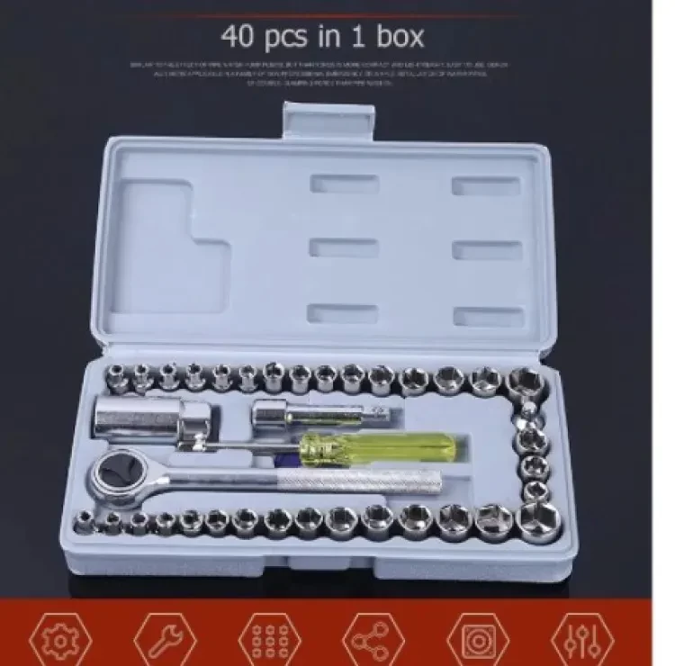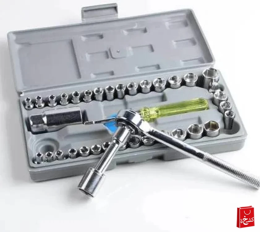 • 🔩 مجموعة كاملة من 40 قطعة – سوكيت، رؤوس، مقبض، ملحقات