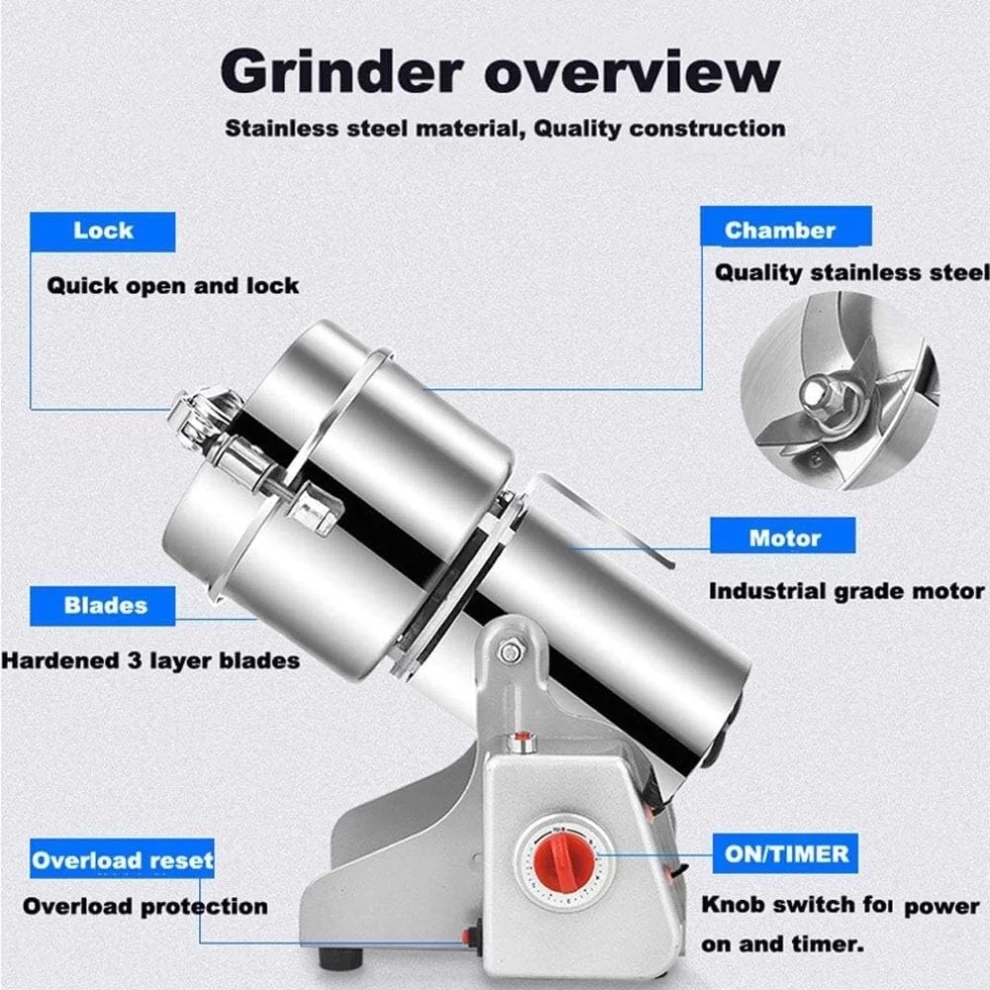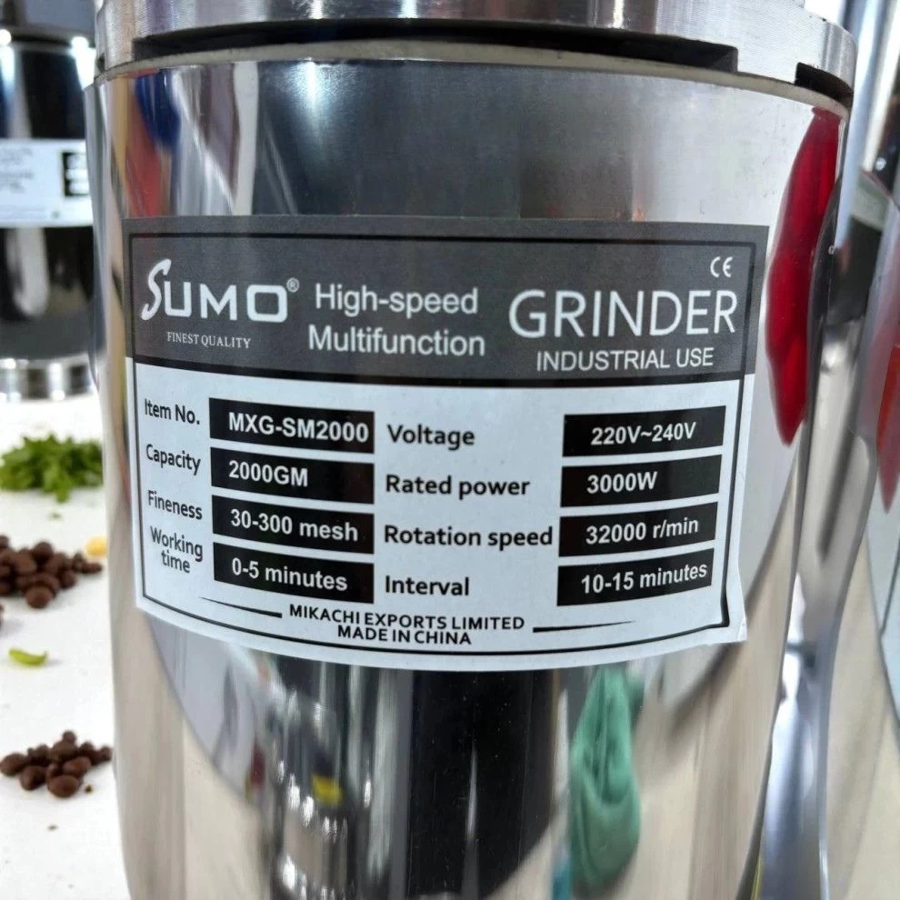 اطحن أكثر في وقت أقل! يتميز هذا الجهاز بمحرك 3000 واط قوي وسعة 2 كيلوغرام مما يجعله مناسبًا للاستخدام الكثيف في المنازل، المقاهي، المطاعم، ومحلات الأعشاب. يقدم لك طحنًا ناعمًا وسريعًا مع تصميم متين من الستانلس ستيل.