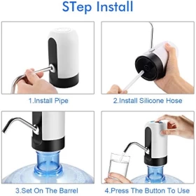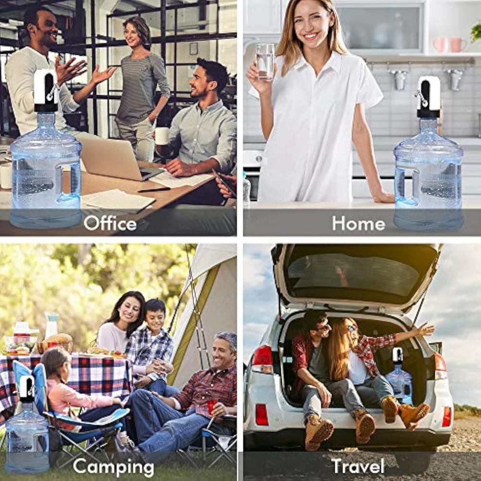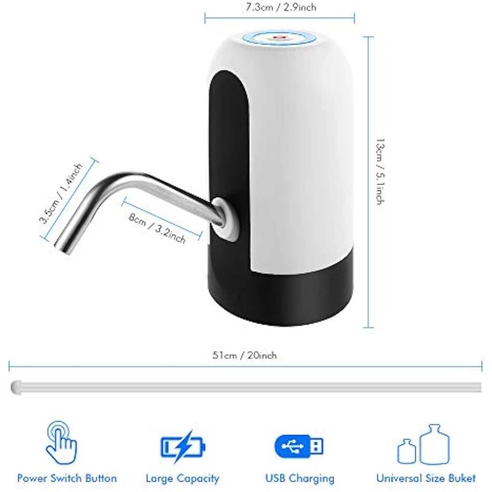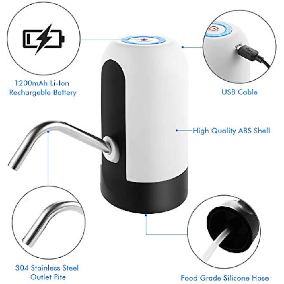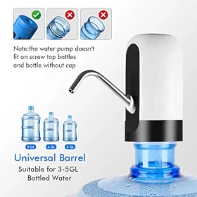 اشرب الماء بسهولة وراحة مع مضخة المياه القابلة لإعادة الشحن عبر USB. مثالية للاستخدام في المنزل، المكتب، السفر، والمخيمات، وتتناسب مع معظم زجاجات الجالون القياسية، وتعمل بزر واحد لتوزيع الماء بدون فوضى.
