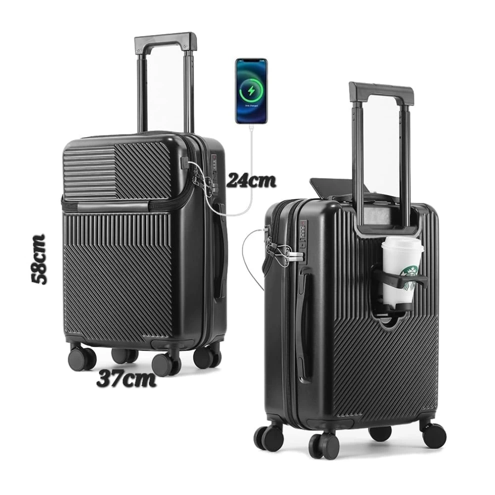 ✈️ حقيبة سفر ذكية صلبة – مع منفذ USB، حامل كوب، وجيب أمامي للابتوب (58x37x24 سم)