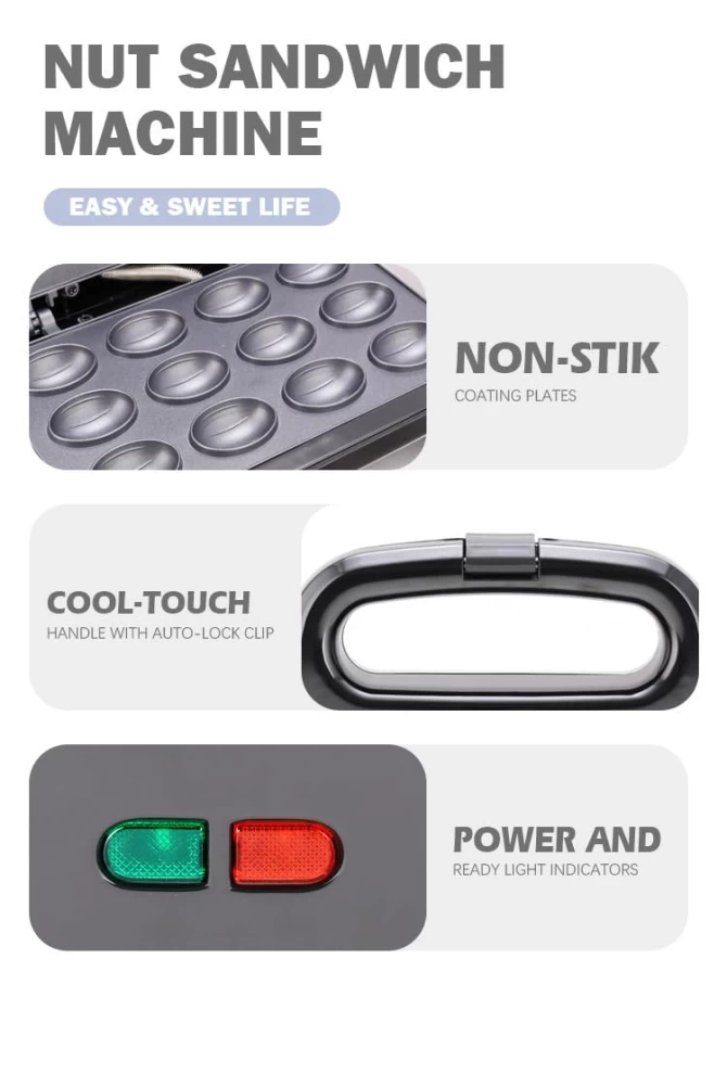 حضّر حلويات على شكل جوز في المنزل بسهولة مع جهاز Walnut Maker SM-7212. بفضل صفائح غير لاصقة ونظام تسخين قوي، يضمن طهيًا متساويًا وسهل الإزالة. خفيف الوزن ومناسب للاستخدام في المنزل، تحضير الحلويات العائلية أو المناسبات.