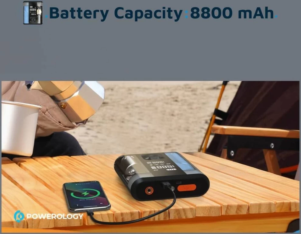 احصل على حل متكامل للطوارئ على الطريق مع منفاخ الهواء وجهاز تشغيل السيارة من باورولوجي. بفضل بطارية 8800mAh، يمكنك تشغيل السيارة عند نفاد البطارية، نفخ الإطارات والكرات، وشحن أجهزتك الذكية بسهولة.