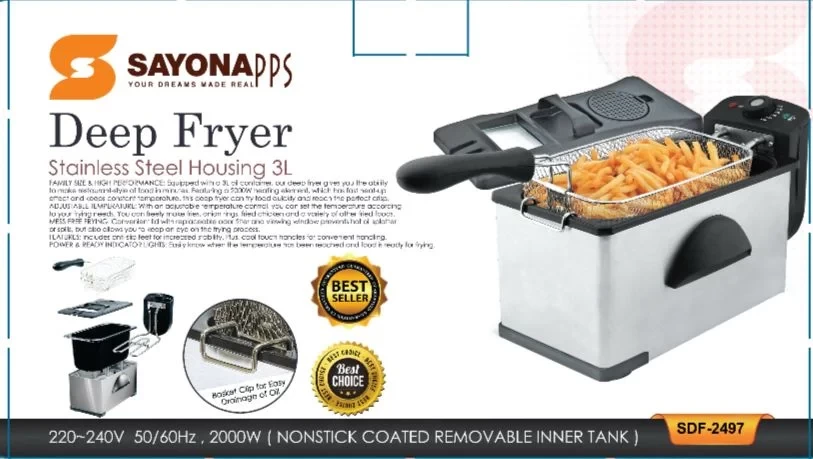 اقلي وجباتك المفضلة بسرعة وبشكل متساوٍ مع قلاية Sayona الكهربائية بسعة 3 لتر. مع هيكل من الستانلس ستيل، تحكم بدرجة الحرارة، وميزات أمان، هذه القلاية مثالية للبطاطس، الدجاج، الأسماك، والوجبات الخفيفة. تصميمها الصغير والقوي يجعل طهي الطعام في المنزل بجودة المطاعم أمرًا سهلاً.
