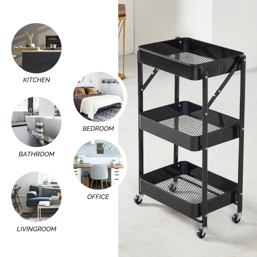 عربة تخزين معدنية متعددة الاستخدام – 3 أرفف قابلة للطي بعجلات مقاس 77×46×30 سم