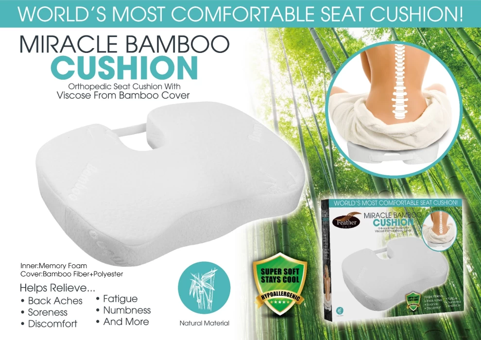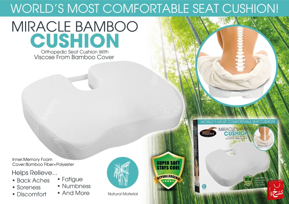 وسادة Miracle Bamboo Cushion توفر راحة فائقة ودعماً طبياً للجلوس. مصنوعة من رغوة ذاكرة عالية الجودة مع غطاء من ألياف البامبو القابلة للتنفس، وتساعد على تخفيف آلام الظهر والتعب والخدر والانزعاج الناتج عن الجلوس الطويل. تصميمها الناعم والبارد والمضاد للحساسية يجعلها مثالية للعمل أو القيادة أو الاسترخاء في المنزل.