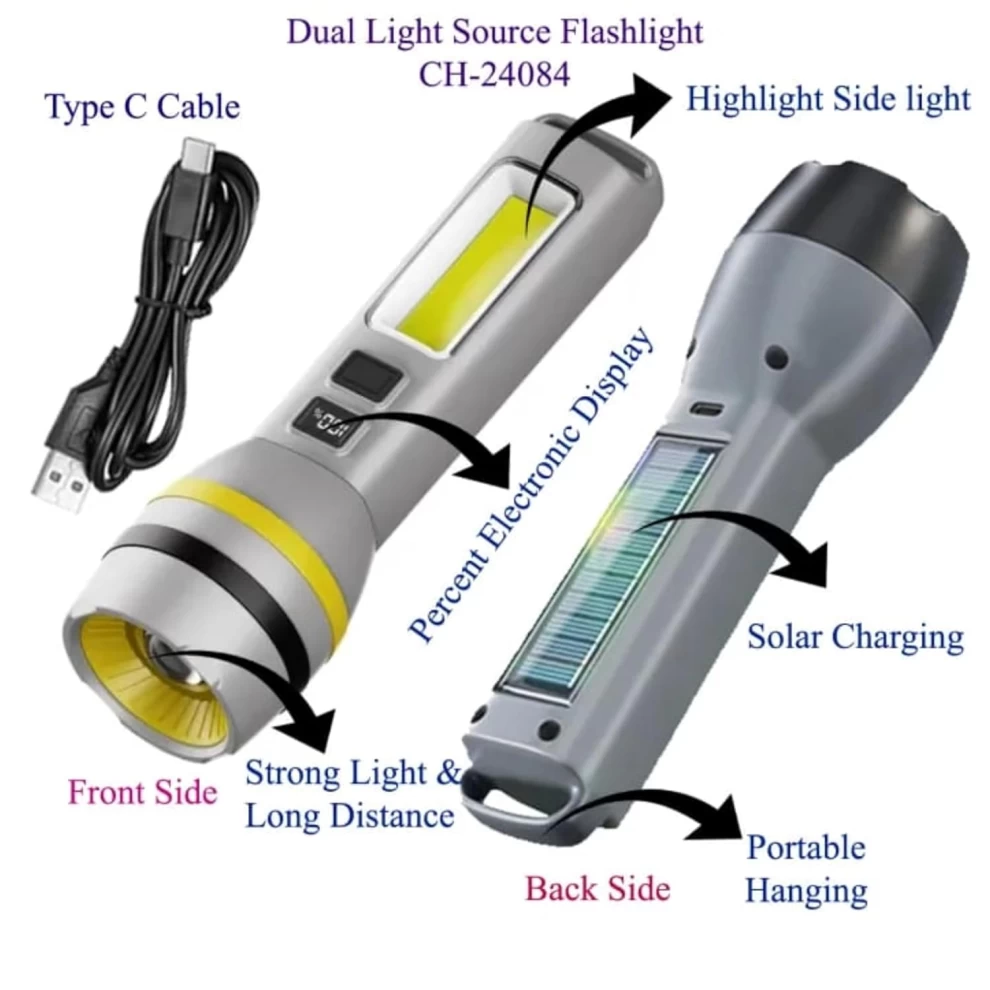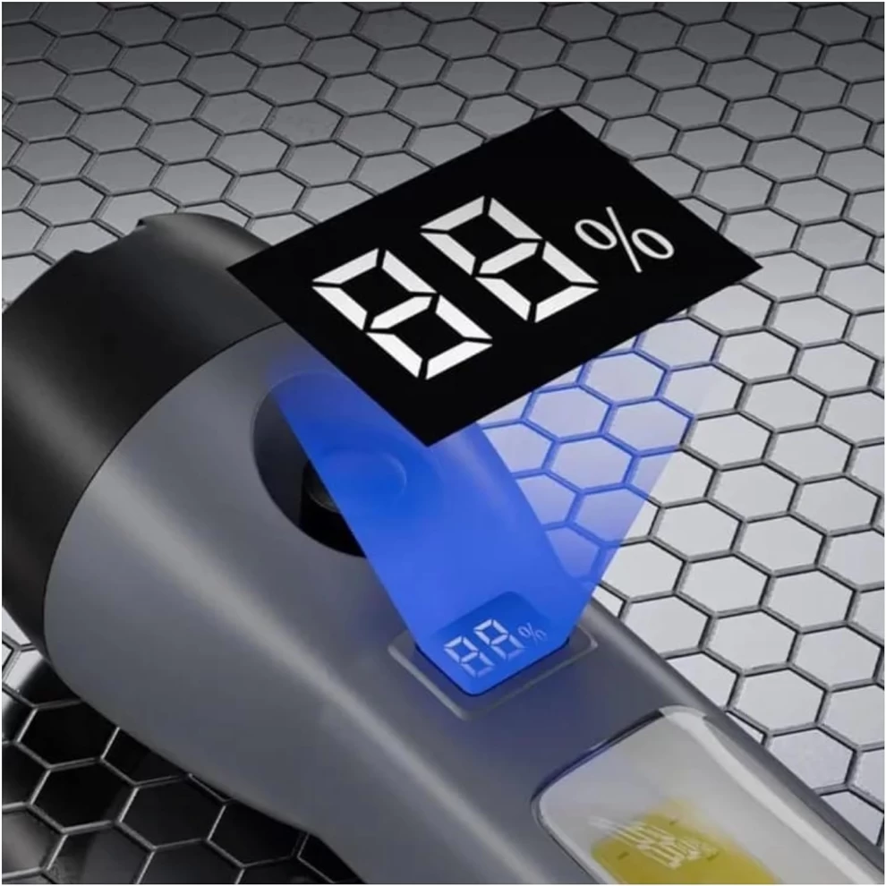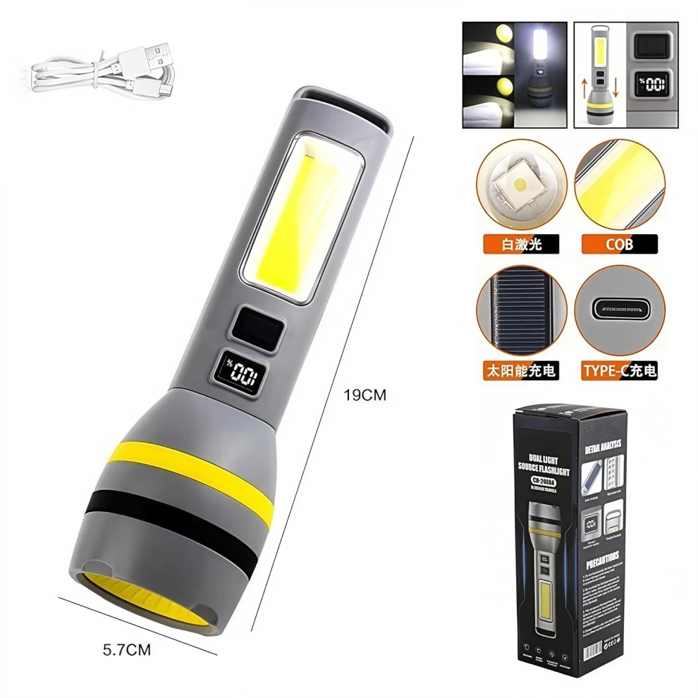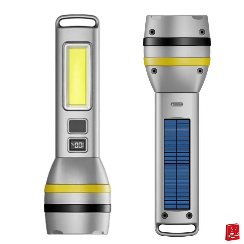 كشاف LED قوي قابل لإعادة الشحن مع تركيز قابل للتعديل، مؤشر بطارية رقمي وشحن USB/طاقة شمسية